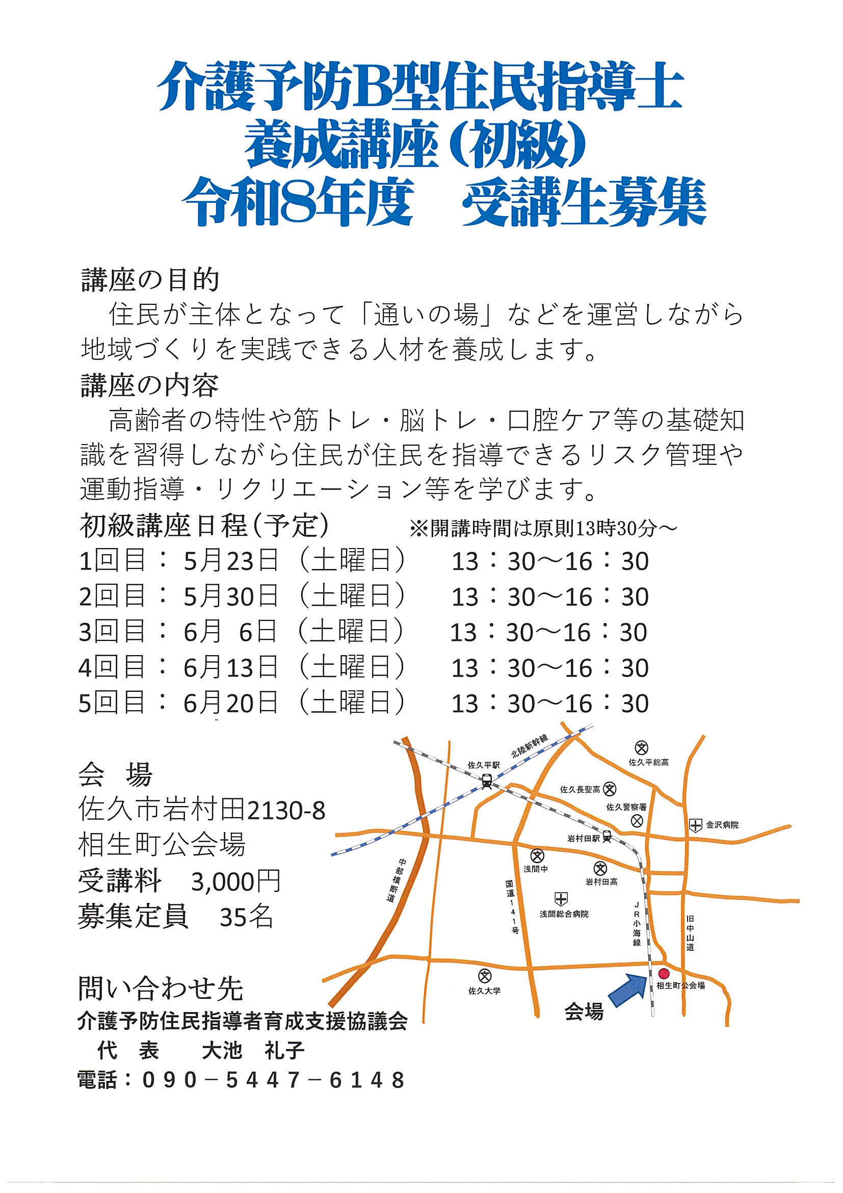 「介護予防B型住民指導士養成講座(初級)」令和8年度受講生募集!