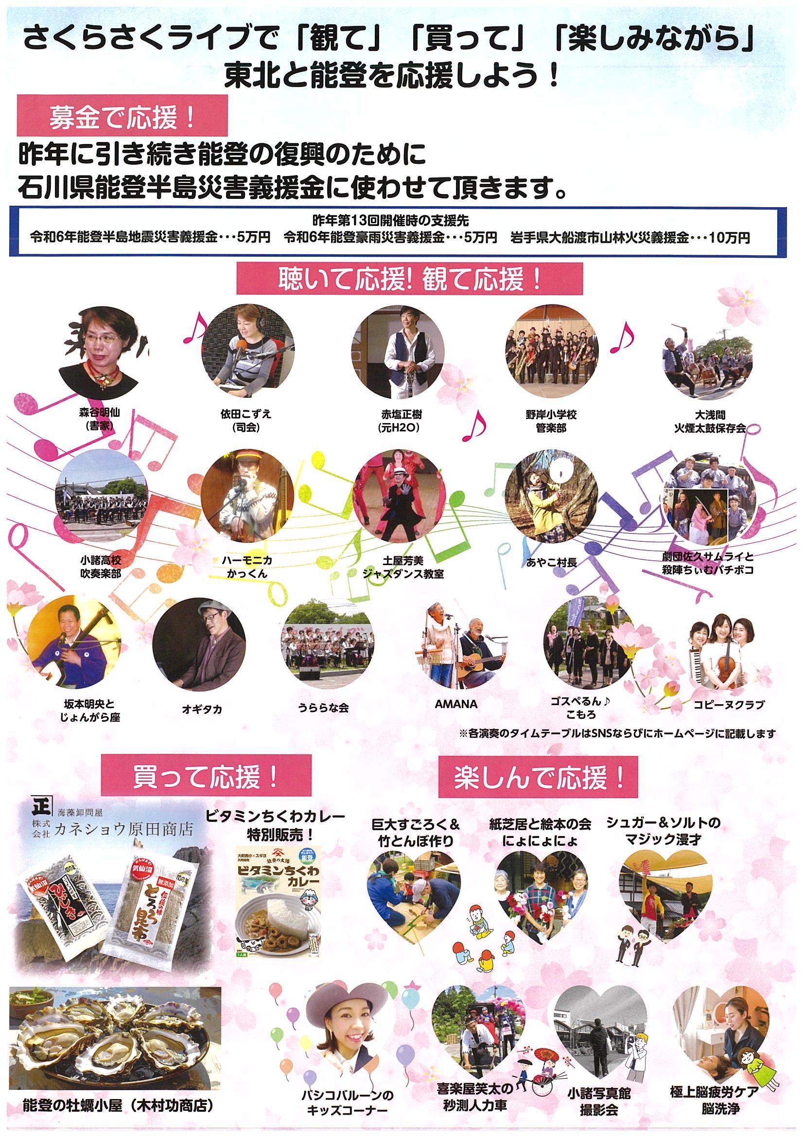 さくらさくライブは、東日本大震災・長野県北部地震への支援を目的に、2011年に初めて催された野外音楽ライブです。以来、年に1度の恒例チャリティライブとして開催され、音楽を通じて被災された各地の復興活動を応援しています。今回のイベントを通して集まった支援金は、能登の復興のために、石川県能登半島災害義援金に使わせていただきます。