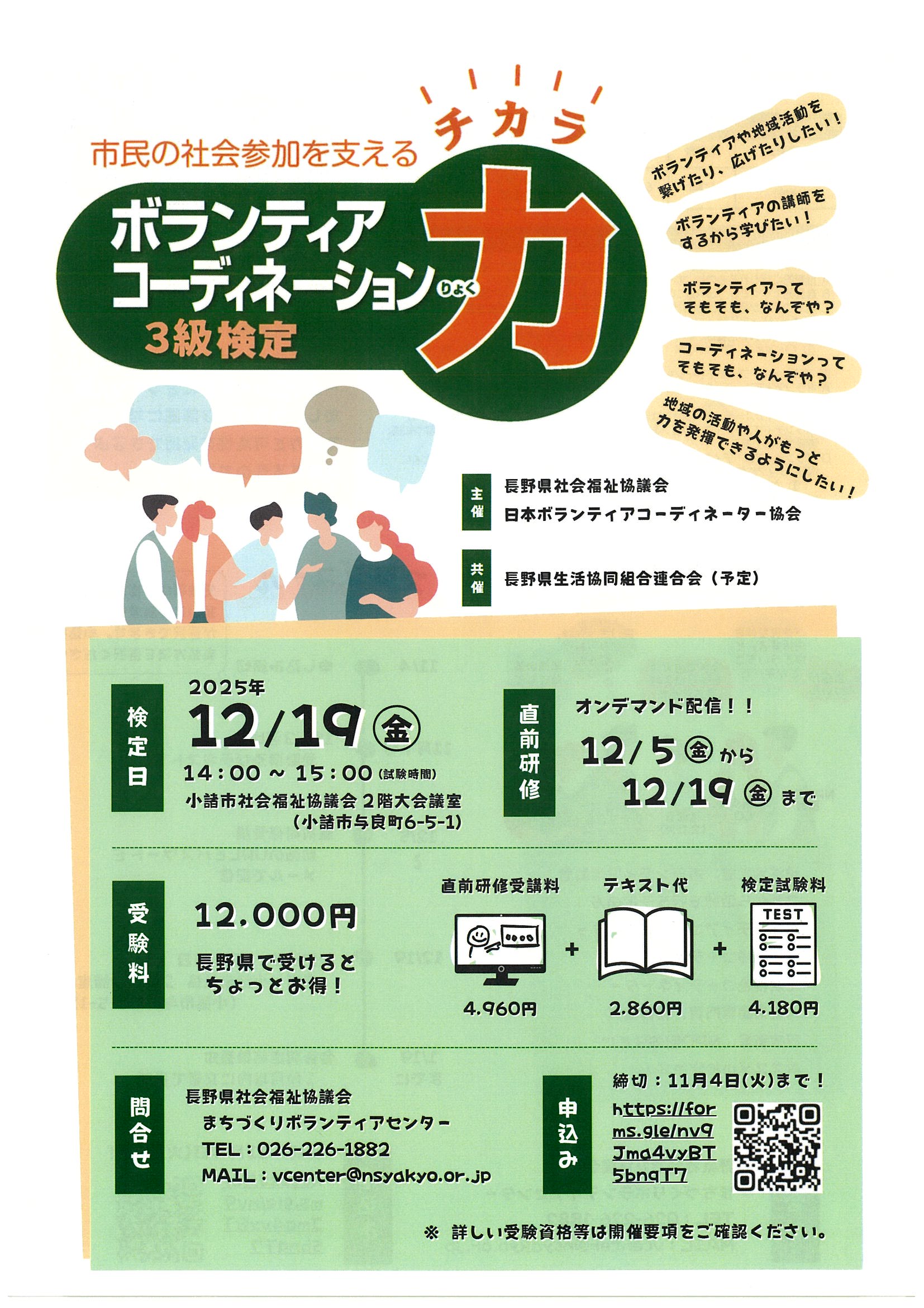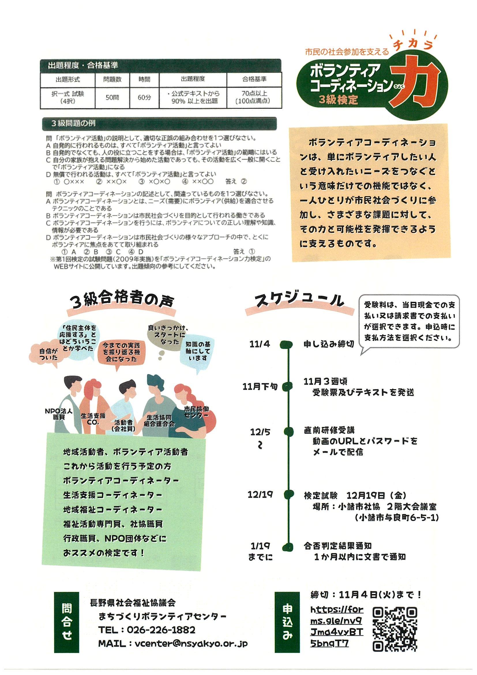 この検定は、一人ひとりが市民社会づくりに参加し、地域の多様な課題解決に取り組むためにも、ボランティア活動を適切に理解し、意義を認め、多様な人や組織が対等な関係でつながる視点を学ぶことを目的に、日本ボランティアコーディネーター協会と長野県社会福祉協議会が主催で実施します。