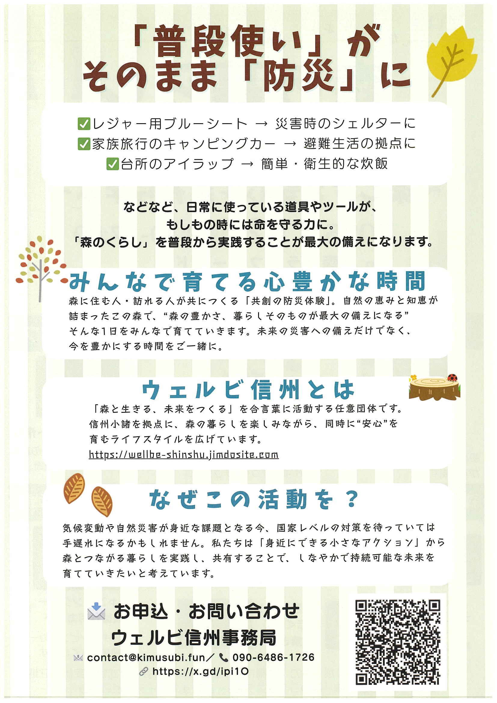 普段の暮らしが、そのままもしもの備えに。森の暮らしを楽しみながら学べる防災イベントです。地域の方や防災に関心がある方など、皆さんのご参加をお待ちしています!