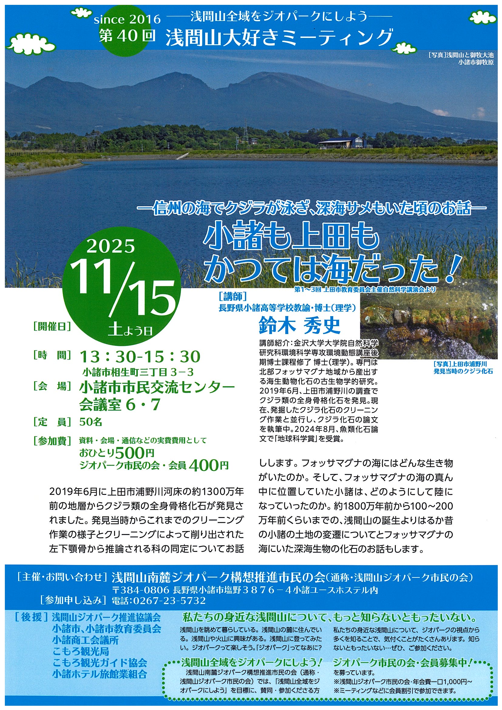 第40回浅間山大好きミーティングは ー信州の海でクジラが泳ぎ、深海サメもいた頃のお話ー「小諸も上田もかつては海だった!」を開催します!
