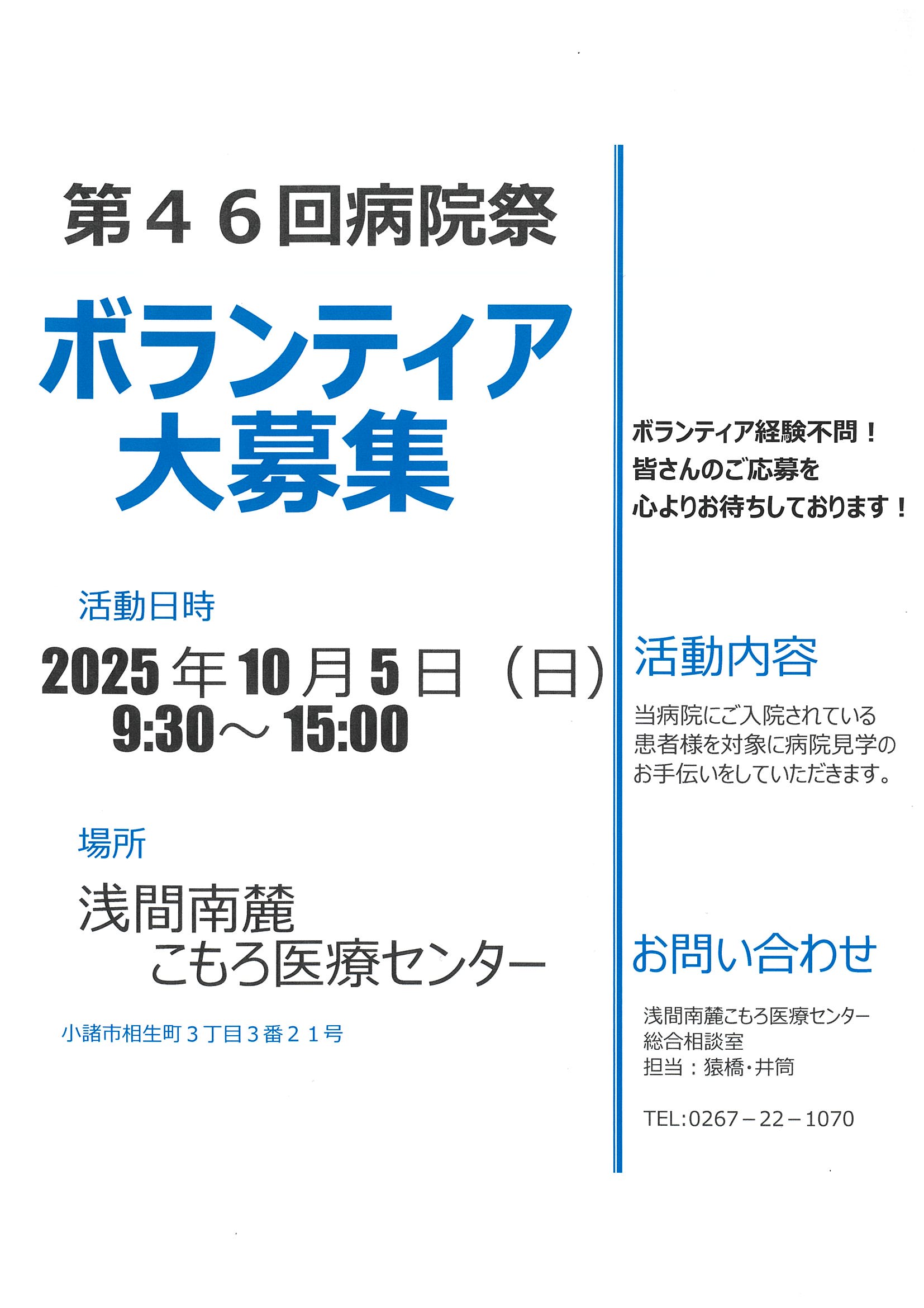 浅間南麓こもろ医療センターでは、病院祭のボランティアをしていただける方を大募集しています!ボランティア経験不問。皆さんのご応募を心よりお待ちしております!