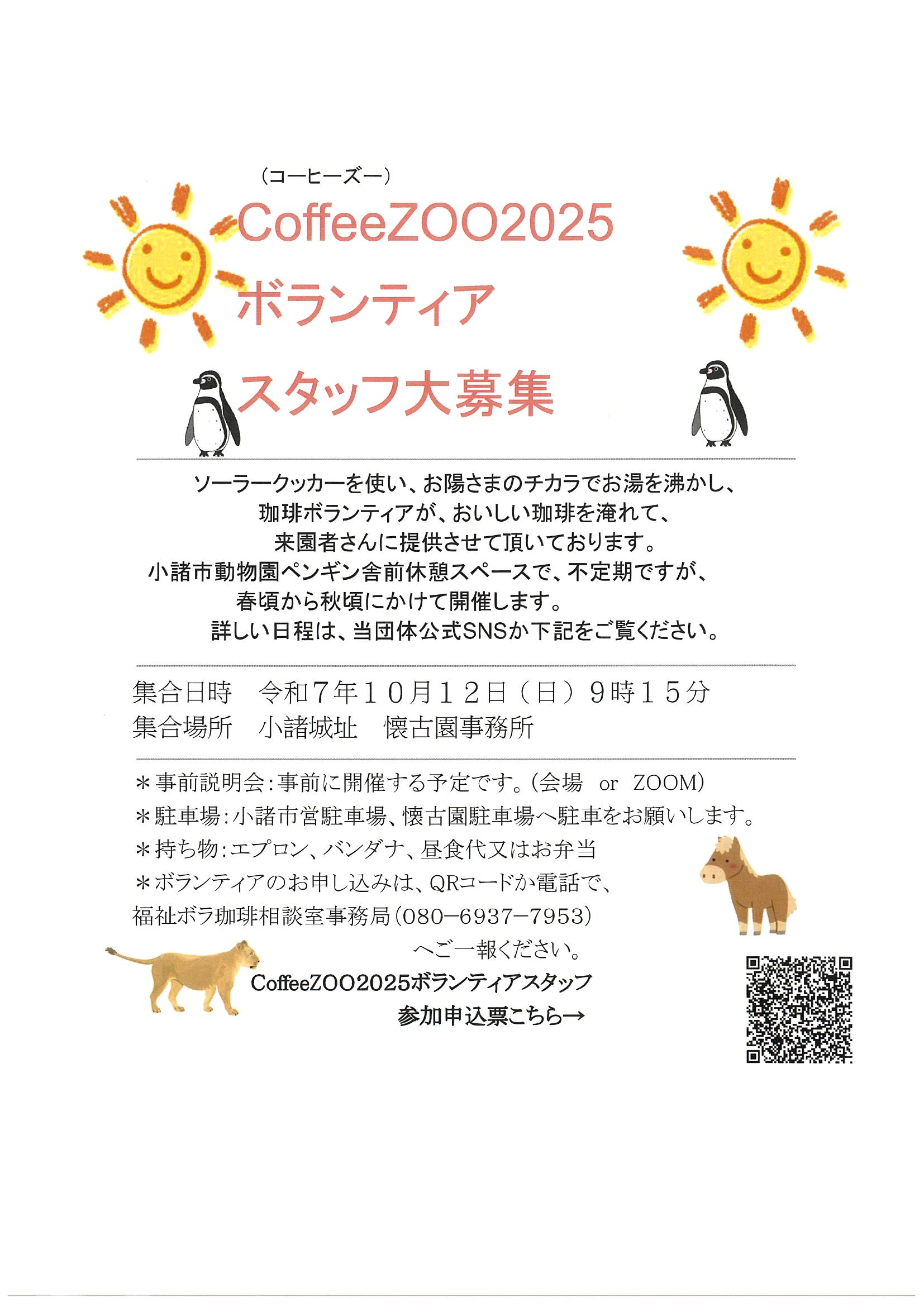 珈琲ボランティアがおいしい珈琲を淹れて、小諸市動物園の来場者さんに提供させていただきます。一緒に活動する仲間を場集中!