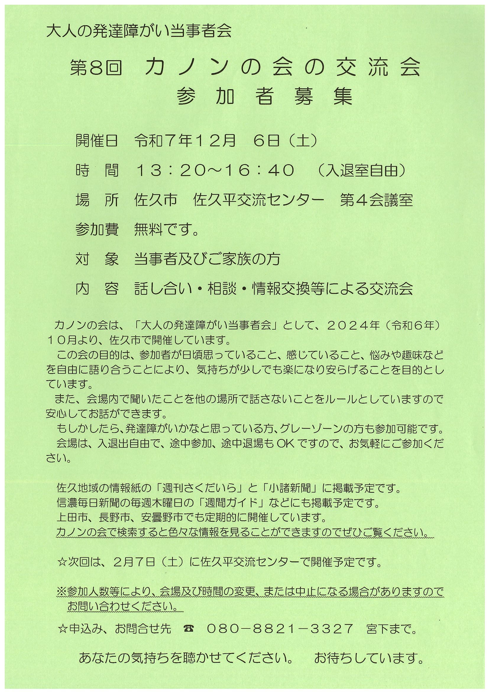 大人の発達障がい当事者会「カノンの会」交流会のお知らせ