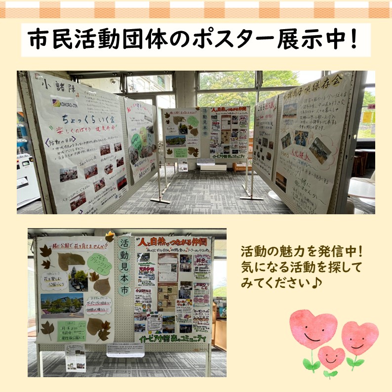 令和7年8月9日に開催した「活動見本市inぼらせんこもろの市民活動講座」で展示されたポスターを、ただいま特別展示中です。市民活動団体が活動の魅力を発信するために制作したポスターをご覧いただけます。