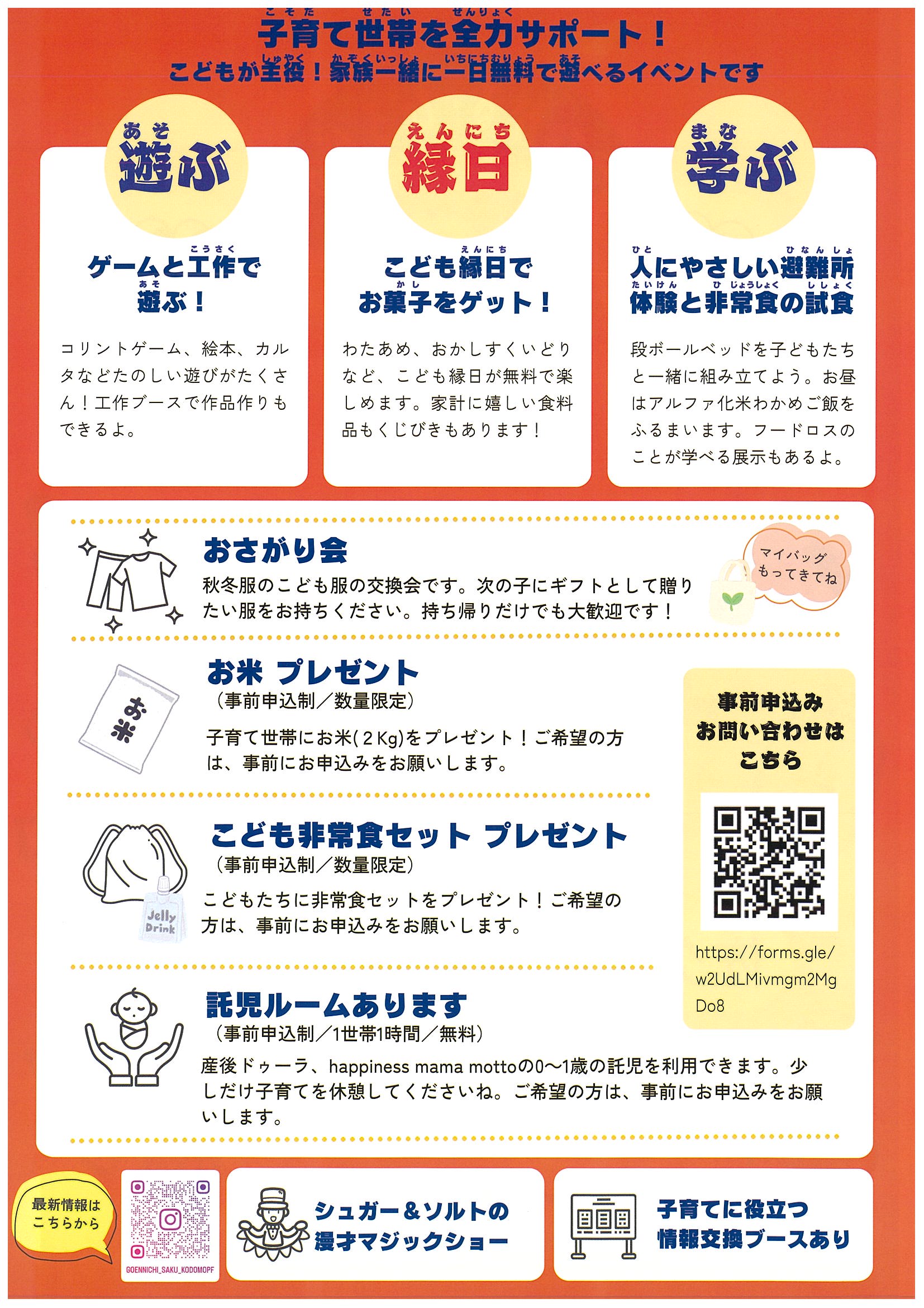 子育て世帯を全力でサポート!こどもが主役、家族と一緒に一日無料で遊べるイベントです!