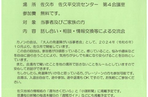 大人の発達障がい当事者会「カノンの会」交流会のお知らせ