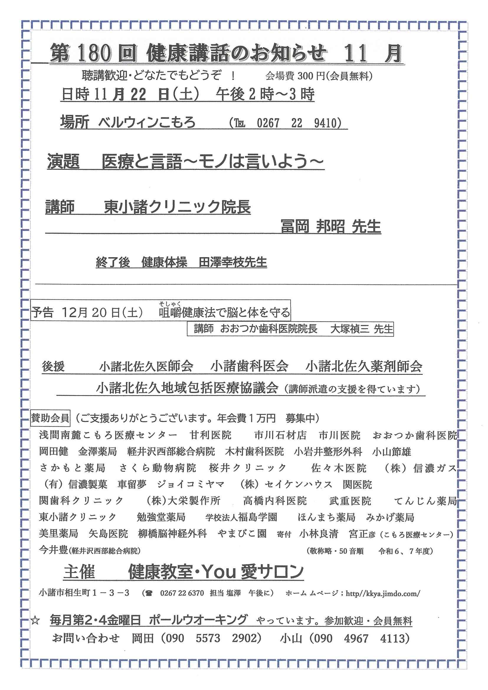 健康教室You・愛サロンでは、毎月第4土曜日午後2時から、ベルウィンこもろにて、健康講話を実施しています。皆様の関心があるテーマで、専門分野の先生がお話しします。ぜひご参加ください。