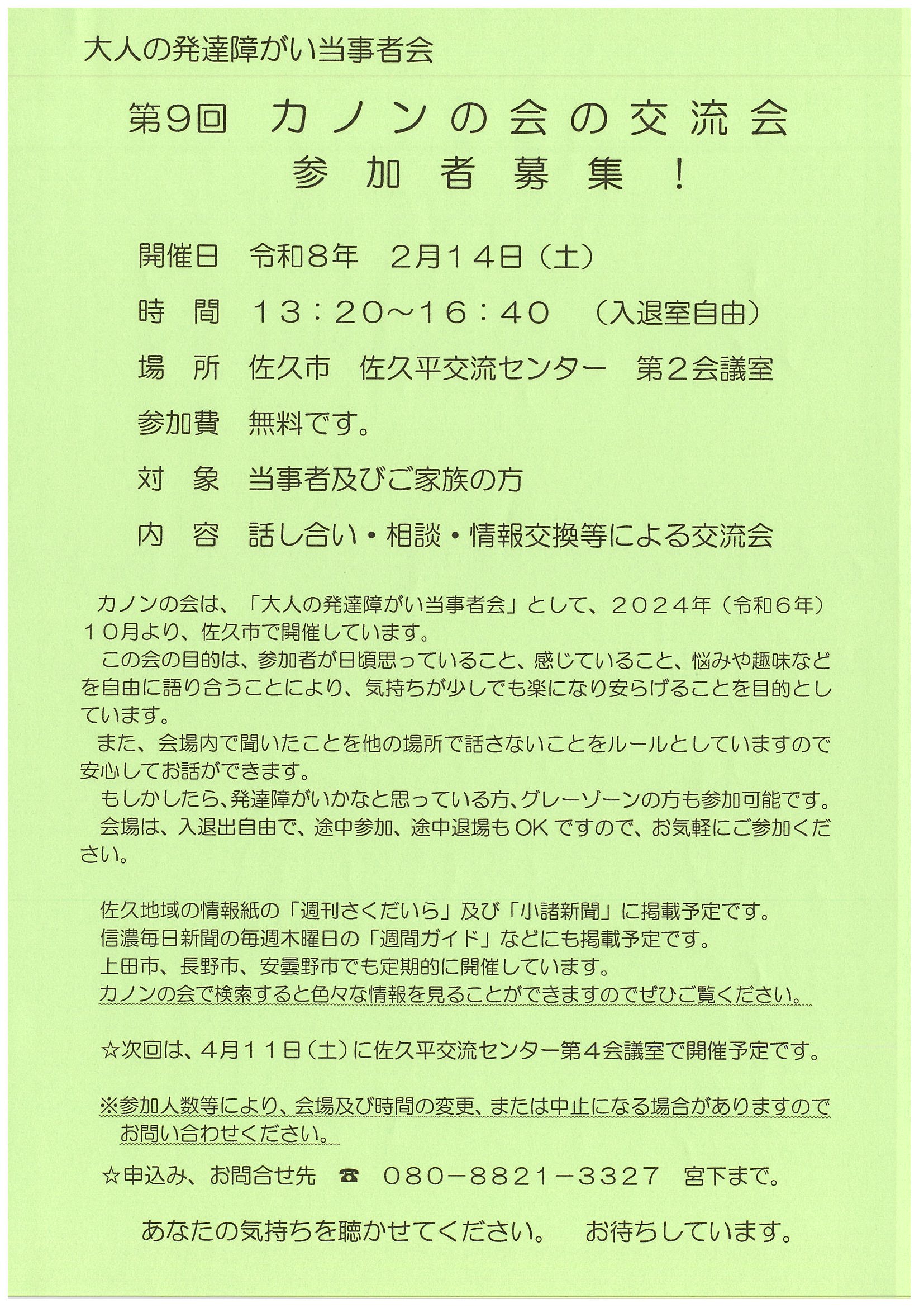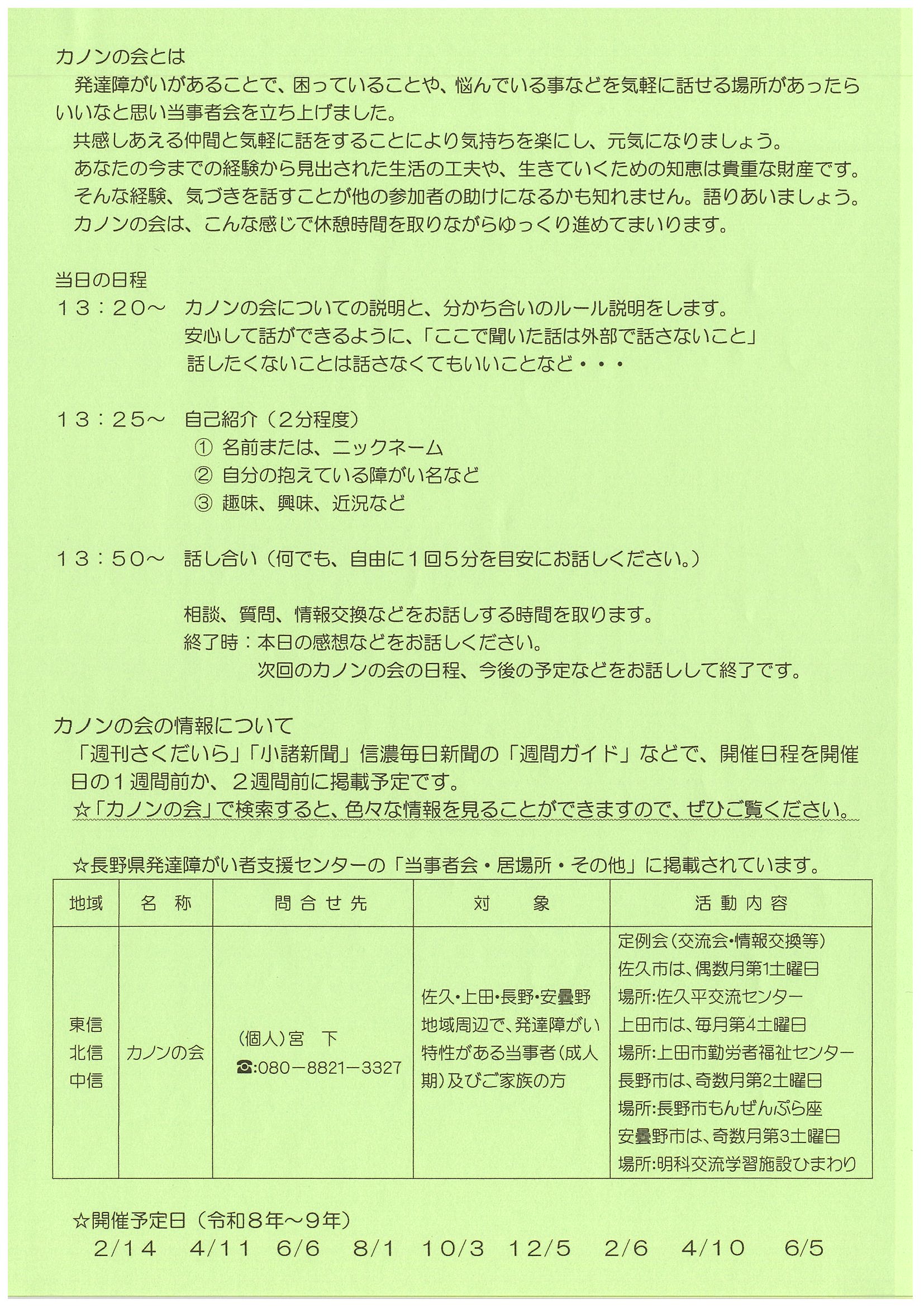 大人の発達障がい当事者会「カノンの会」交流会のお知らせ