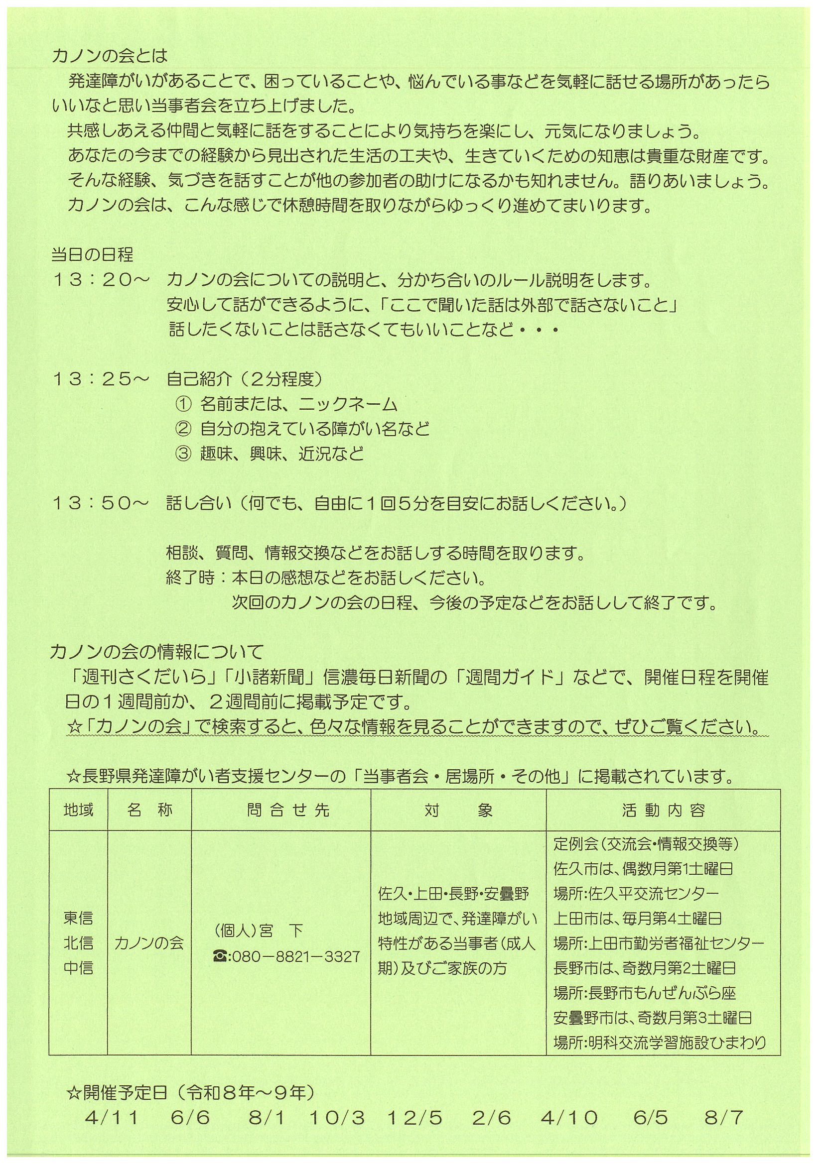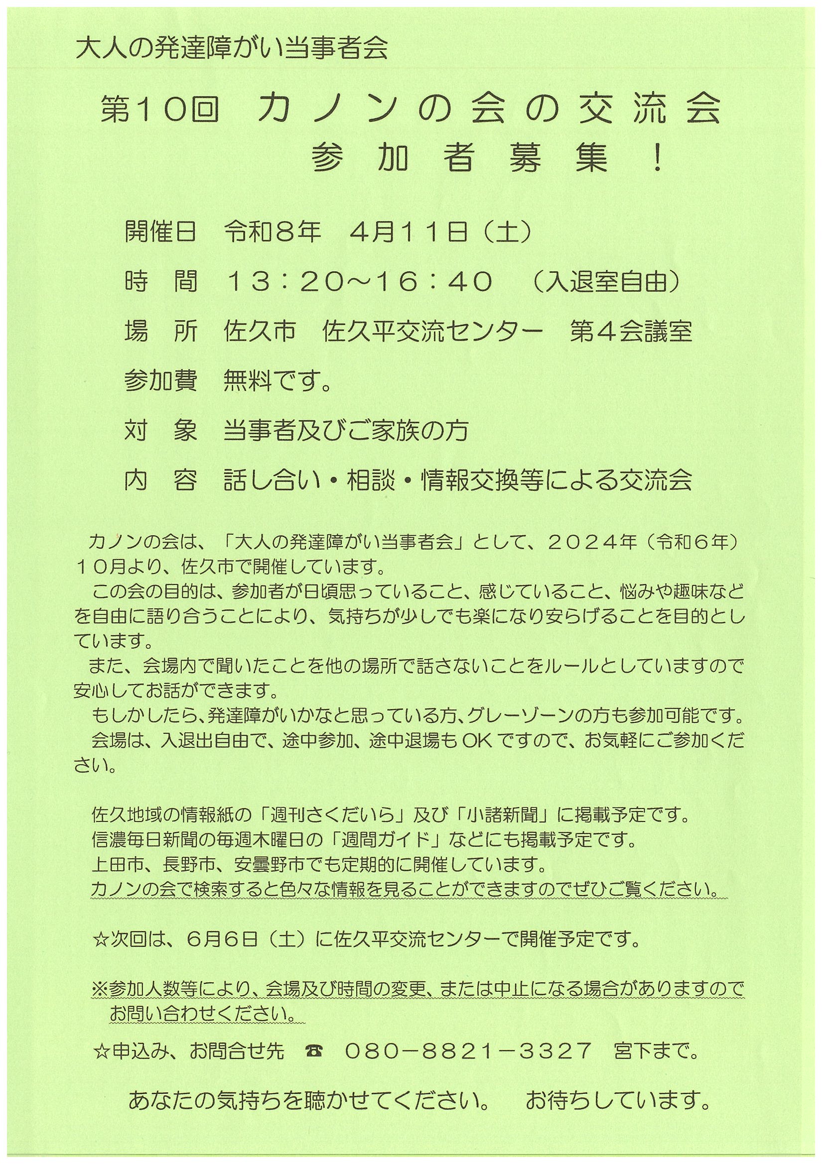 大人の発達障がい当事者会「カノンの会」交流会のお知らせ