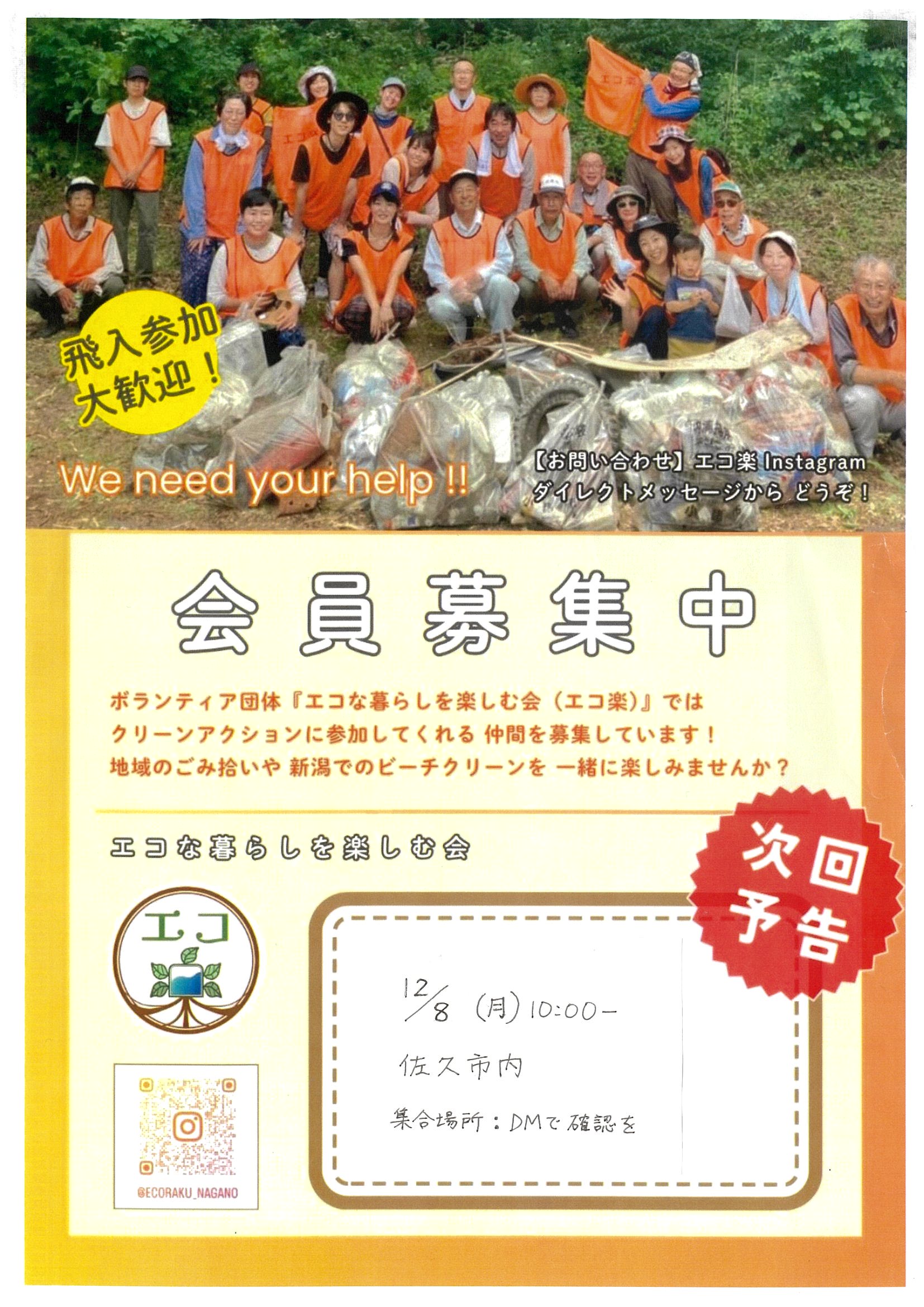 ➢12/8(月)10:00~12:00 佐久市内(集合場所はDMでお問い合わせください)